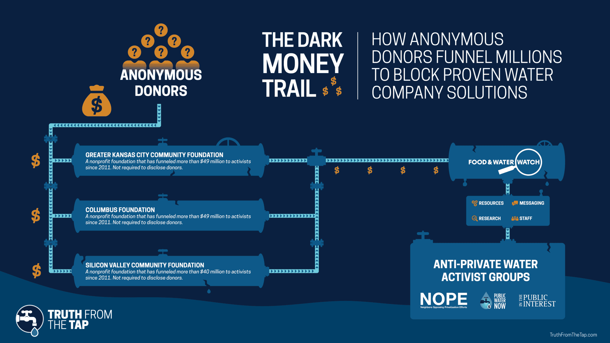 The web of anti-private water activist groups is hard to untangle as many of the groups share resources, research, messaging and even staff to block solutions offered by water professionals. Since 2011, Food & Water Watch has received more than $158 million in anonymous funding, raising questions about who is really controlling their agenda. Further, numerous community foundations are complicit, serving as the vehicle through which funding is anonymously funneled to activists. These ideological opposition groups oppose common sense, bipartisan solutions without offering realistic alternatives.