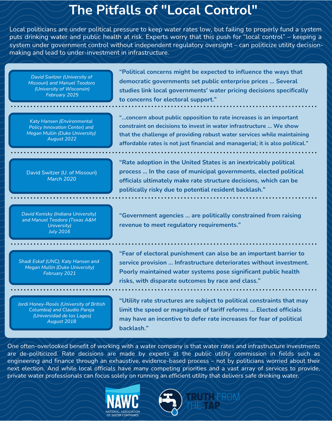 The new infographic compiles insights from various academic studies and experts that show why keeping a water system under government control, without independent regulatory oversight, introduces significant challenges.